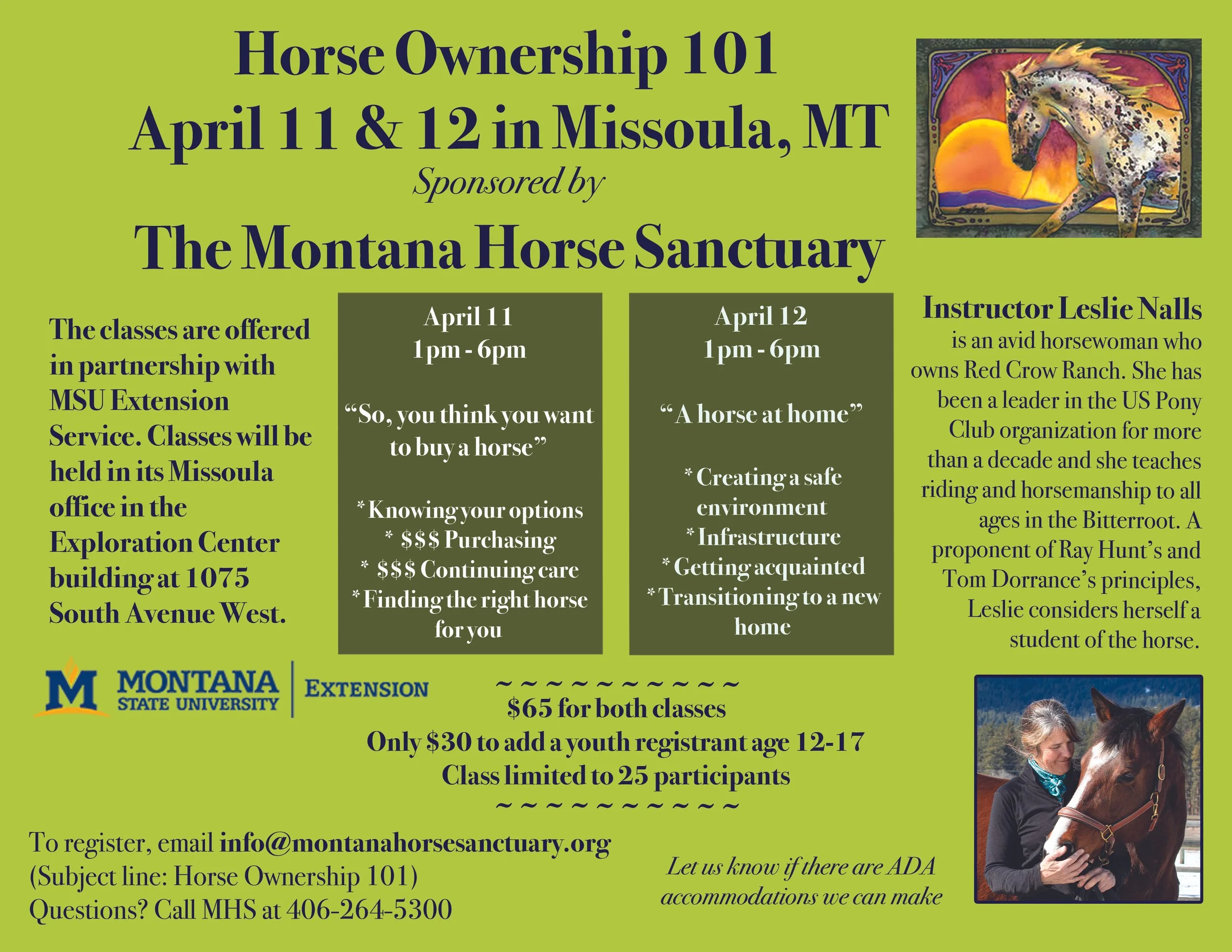 To register, email info@montanahorsesanctuary.org. Please put “Horse Ownership 101” in the subject line. We will contact you with registration details.
